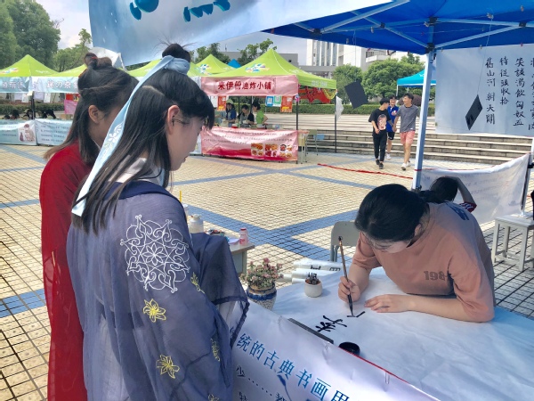 汉服社、兰亭书协、手工协会、武术协会等学生社团展现了中华传统文化社团的刚柔与雅美。衢州市第六届“礼遇衢职 创赢未来”大学生工商模拟市场大赛正在思齐广场上进行,在衢州市委市政府创建“南孔圣地 衢州有礼”城市品牌的大背景下,开设“有礼一条街”,将衢州“礼”文化的精髓融入到校园文化,让广大青年学生在参赛的同时能成为“有礼衢职人”,真正做到文化自信。星巴克、泰隆银行等校企合作企业的优秀毕业生代表向大家展示了我校校企合作成果,经济管理学院“杜拉拉训练营”的同学向大家汇报职场文化、白领文化的训练成果,花为你开、南孔爷爷等项目都进入到大学生工商模拟市场大赛的舞台。很多市民朋友带着孩子们“赶集”来了,李梦然小朋友抓完鱼之后,在榨汁店买了一杯西瓜汁和她的小伙伴分享。工模大赛通过真实的市场检验,进一步强化了学生们的创业水平与营销能力。