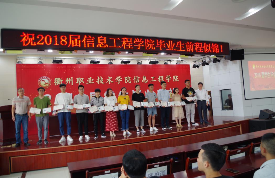 毕业典礼共十项议程,当庄严的国歌响起,毕业典礼正式开始。江爱民和余建军分别宣读了信息工程学院2018届毕业生名单、省级优秀毕业生名单,并向他们表示祝贺。接着,江爱民和何百通分别为毕业生代表及省级优秀毕业生,颁发毕业证书和荣誉证书。