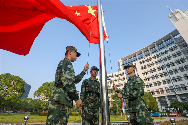 校园国旗护卫队雄姿英发,昂首阔步,走向升旗区域。这是一支“特殊”的队伍,成员均为退伍复学大学生,他们的飒爽英姿,早已成为清晨校园里最亮丽的一道风景线。