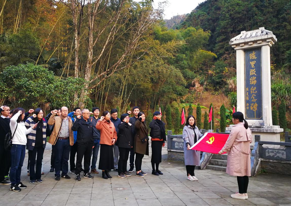 在瑶里改编纪念碑前,全体党员在机关第四党支部支委叶美丽的带领下进行宣誓。