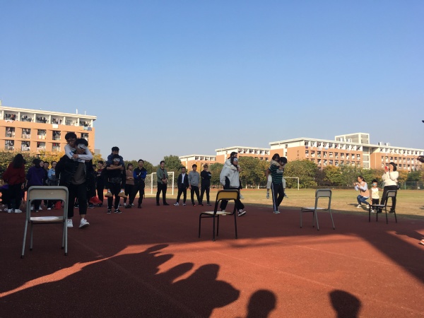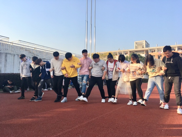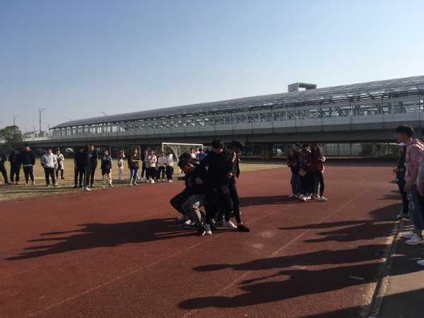 活动设置有趣的团体比赛项目,比拼各个小组的团结协作能力。如“坐地起身”要求小组成员背对背的坐在地上,不用手撑地站起来; “爱的接力”在常规的接力跑中增加跳绳、仰卧起坐、托球等元素; “信任之旅”中由“瘸子”为“瞎子”(用纱巾蒙住眼睛)引路,“瞎子”要背上“瘸子”,绕过路障到达钟点;“十人九足”中相邻的人把腿系在一起,一起跑向终点…… 活动在欢声笑语中进行, 让同学们享受到了运动的快乐,也增强了他们的团结、竞争和合作意识。