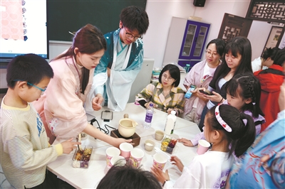 报名成功的12名学员陆续来到课堂,来上课的学员有孩子,也有对中药感兴趣的中老年市民。市民曾玉婷说,虽然学员不多,但师生们准备得非常充分。学员们分成三组制作中药奶茶,每组都配备了两位大学生助教。