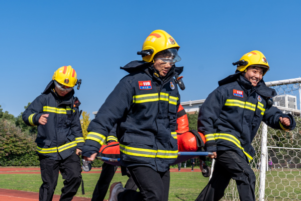 本次运动会设置了消防战斗服原地着装、灭火接力、火场逃生、抬送120斤假人“伤员”等消防技能比赛项目。同学们在实际操作中学习如何正确使用灭火器、快速连接水带以及掌握逃生技巧。这些项目不仅考验了同学们的体能和反应速度,更重要的是让他们在轻松愉快的氛围中掌握了关键的消防技能。
