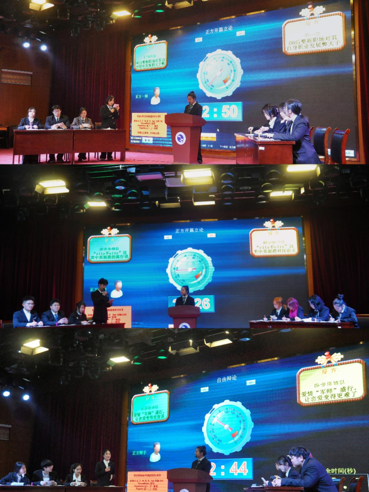 本次辩论赛全校共有12支队伍报名参加,经过初赛、半决赛的激烈角逐,最终4支队伍脱颖而出,进入总决赛。本次比赛共分为三场进行,前两场为一二三等奖争夺赛,第三场为表演赛,分别围绕“00后整顿职场对其自身职业发展利大于弊还是弊大于利”“‘city不city’这类中英混搭的流行语对汉语文化发展利大于弊还是弊大于利”以及“爱情‘军师’盛行,让恋爱变得更容易还是更难了”三个辩题展开。辩手们引经据典、唇枪舌剑、妙语连珠,为场下观众带来了精彩的视听享受。
